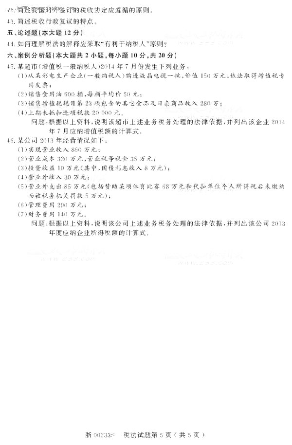 全国2014年10月自学考试《税法》真题(打印word版)(五)