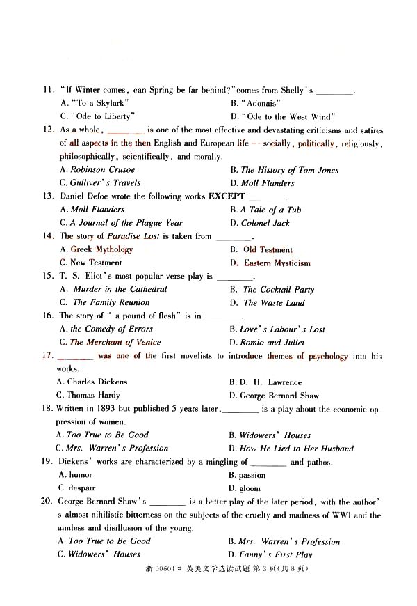 全国2014年10月自学考试《英美文学选读》真题(打印word版)(三)