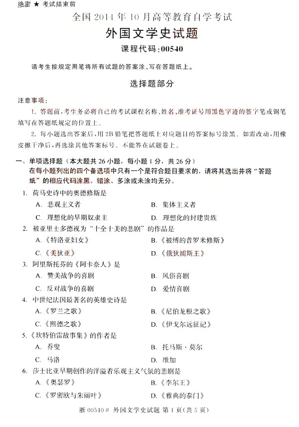 全国2014年10月自学考试《外国文学史》真题(精美word版)(一)