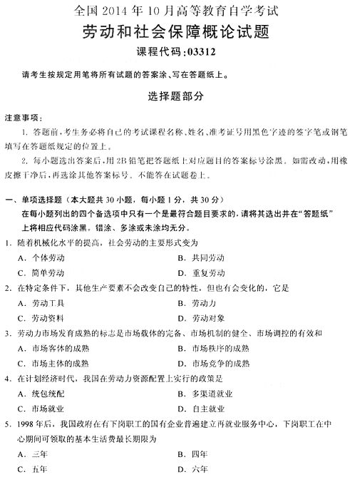全国2014年10月高等教育自学考试劳动和社会保障概论真题(完美word版)(一)