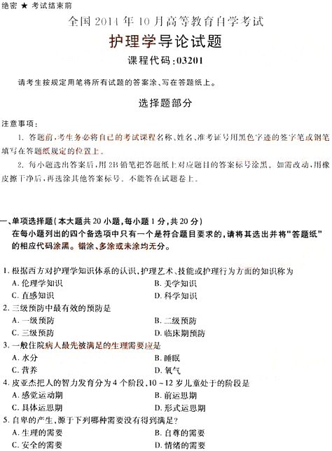 全国2014年10月自学考试《护理学导论》真题(word下载版)(一)