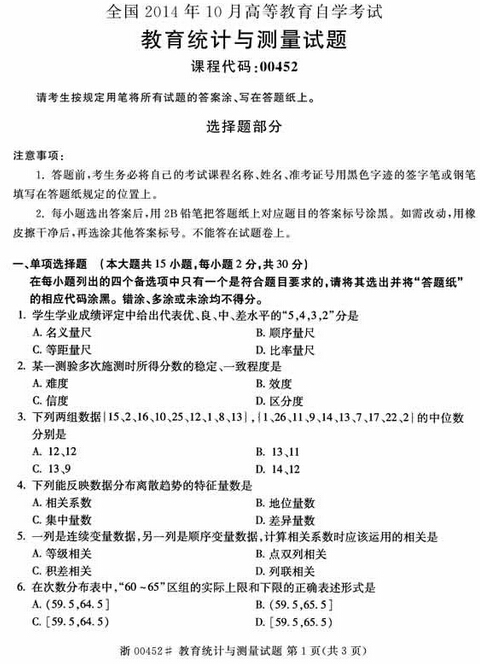 全国2014年10月自学考试教育统计与测量真题(打印word版)(一)