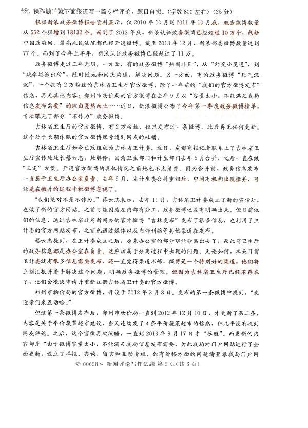 全国2014年10月自学考试《新闻评论写作》真题(打印word版)(五)