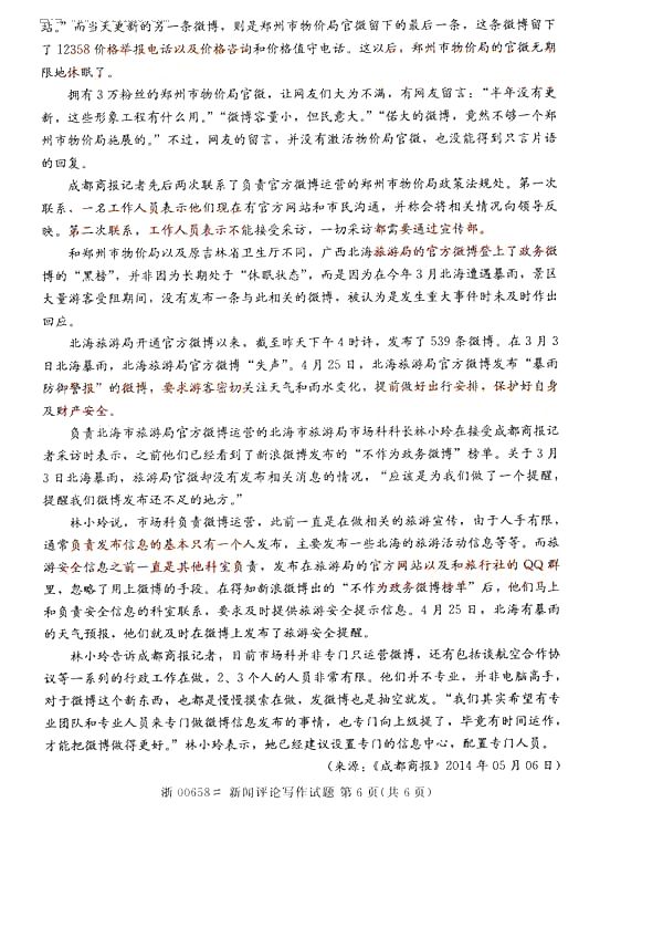 全国2014年10月自学考试《新闻评论写作》真题(打印word版)(六)