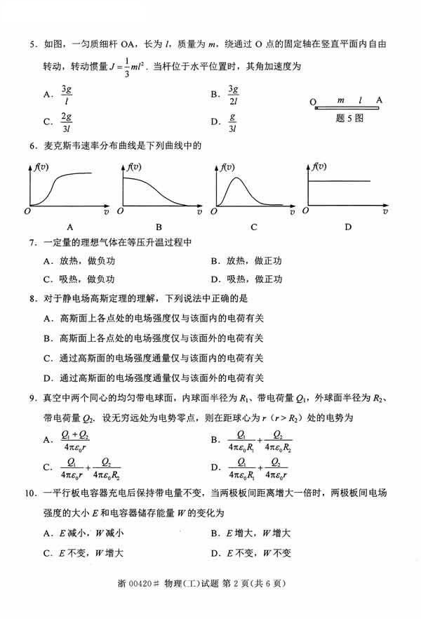 全国2014年10月自学考试《物理(工)》真题(word下载版)(二)