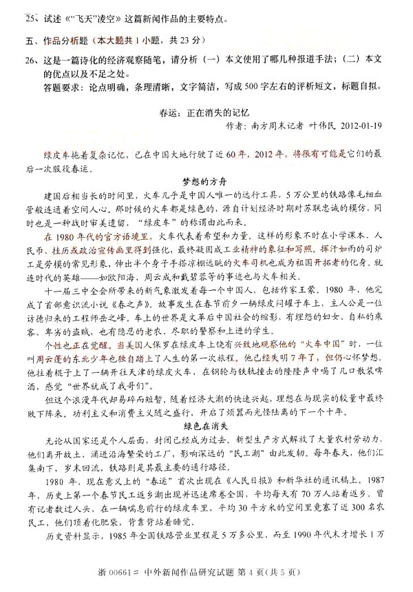 全国2014年10月自学考试《中外新闻作品研究》真题(精美word版)(四)