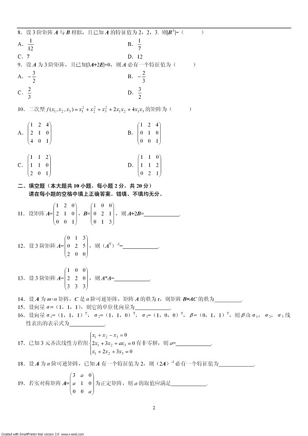 全国2007年10月自考线性代数(经管类)试题 (完整word版)