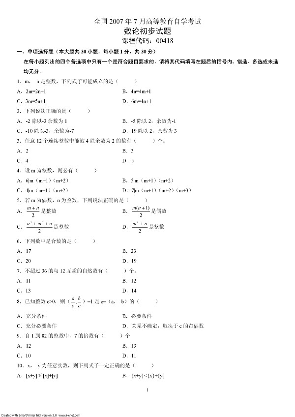 全国2007年7月自考数论初步试题 (word下载版)